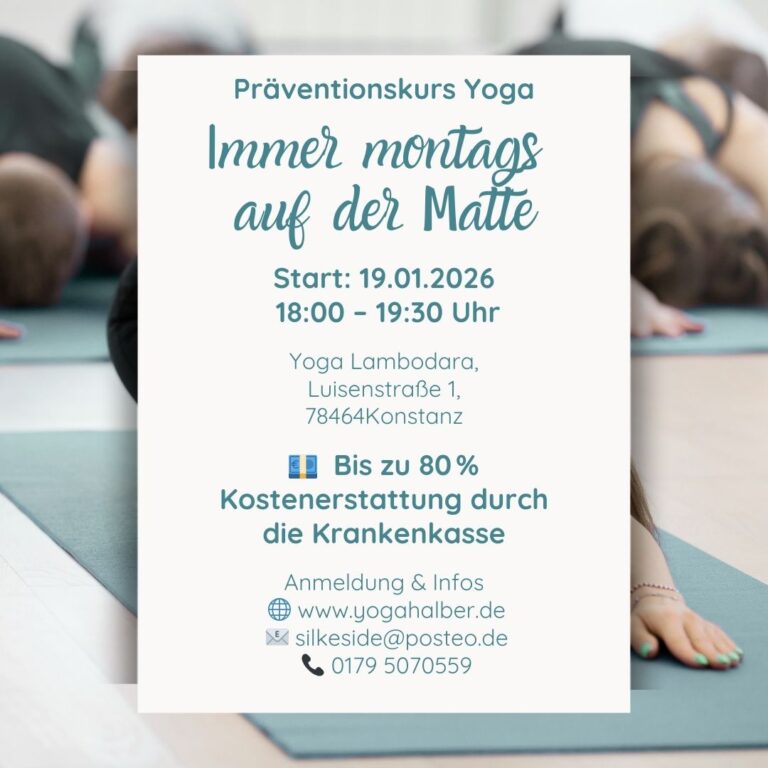 Melde dich jetzt für den Hatha Yoga Präventionskurs in Konstanz an und sichere dir deinen Platz! Dieser Kurs wird von der gesetzlichen Krankenkasse zweimal im Jahr bezuschusst. Egal ob Anfänger oder Wiedereinsteiger – der Yoga Präventionskurs in Konstanz bietet dir die ideale Möglichkeit, Hatha Yoga zu erlernen und deine Gesundheit zu fördern.